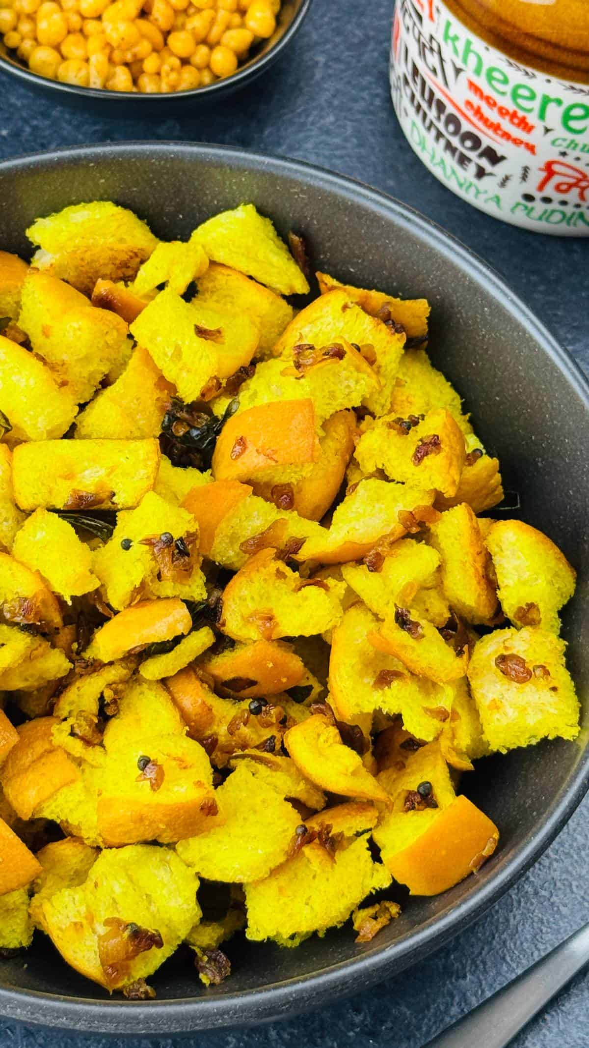 Bread Upkari (also known as Bread Upma or Bread Poha) is a Konkani recipe that is made by tossing pieces of bread in a simple South Indian style tempering. Great for a quick breakfast or tea time snack!